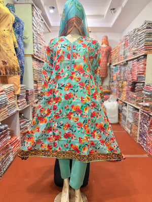 This 3-piece stitched Lawn suit for women includes a short shirt, trouser, and dupatta. Made with good quality fabric, it's comfortable and perfect for daily wear or small events. A simple and stylish choice for any occasion.